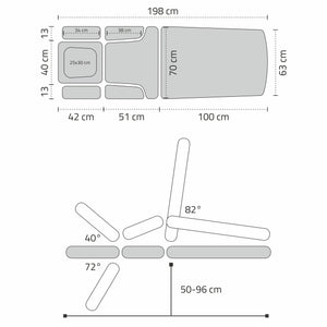Headrest with face cutout, Ergo cushion and two adjustable armrests